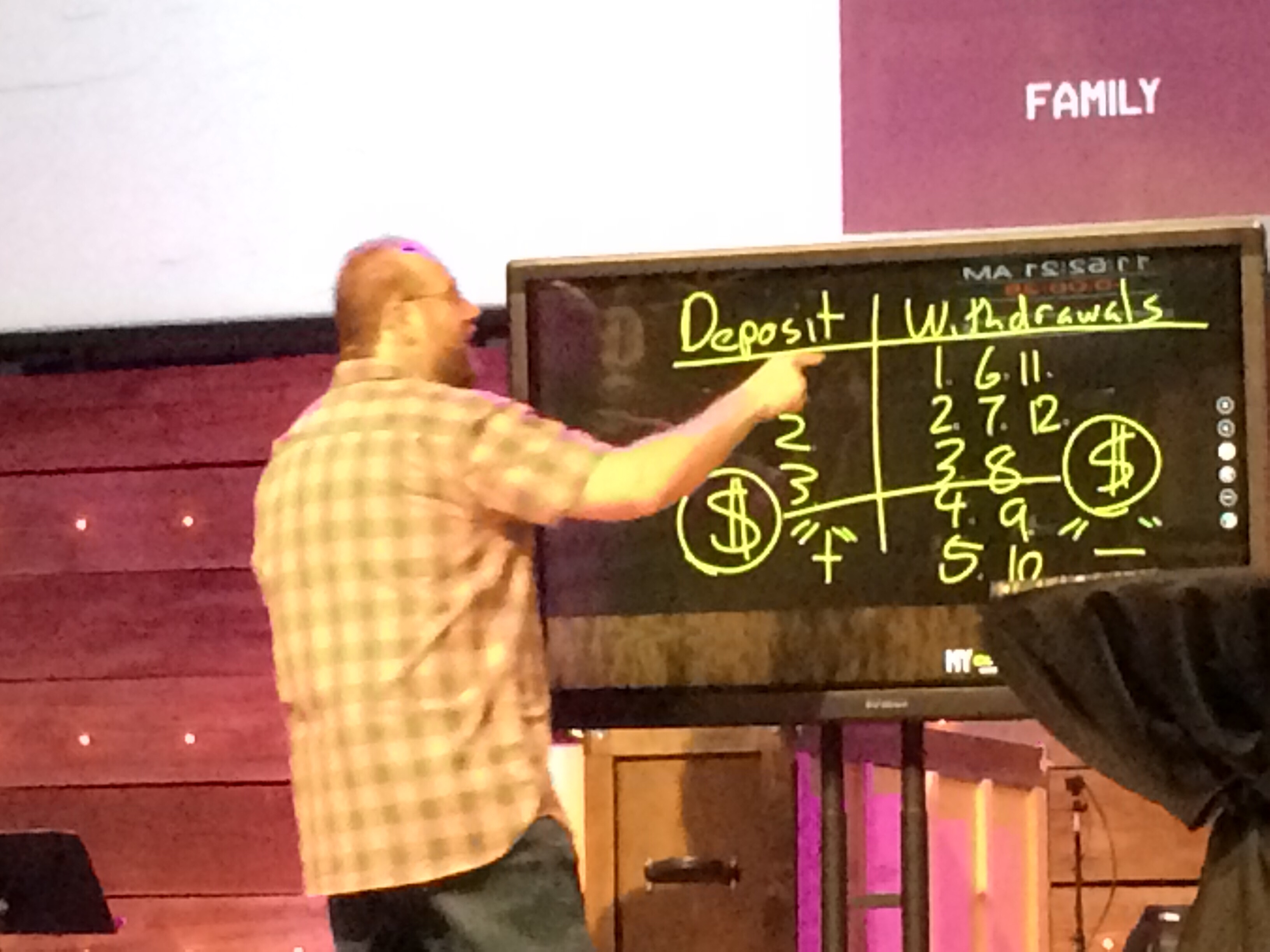 I was at an excellent multi-site ministry in Kansas earlier this month, Crosspoint. Lead Pastor, Andy Addis, worked in a simple illustration during a sermon using basic money principles. He did not shy around the topic. And he leveraged it to also show how salvation through Jesus is not like this (a ledger of credits and withdrawals).